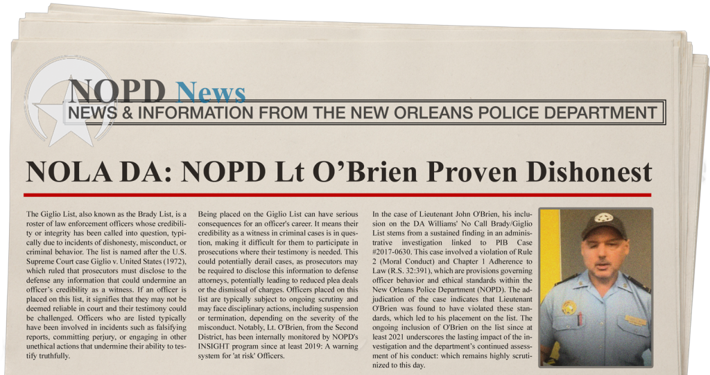 Being placed on the Giglio List can have serious consequences for an officer’s career. It means their credibility as a witness in criminal cases is in question, making it difficult for them to participate in prosecutions where their testimony is needed. This could potentially derail cases, as prosecutors may be required to disclose this information to defense attorneys, potentially leading to reduced plea deals or the dismissal of charges. Officers placed on this list are typically subject to ongoing scrutiny and may face disciplinary actions, including suspension or termination, depending on the severity of the misconduct. Notably, Lt. O’Brien, from the Second District, has been internally monitored by NOPD’s INSIGHT program since at least 2019: A warning system for ‘at risk’ Officers.